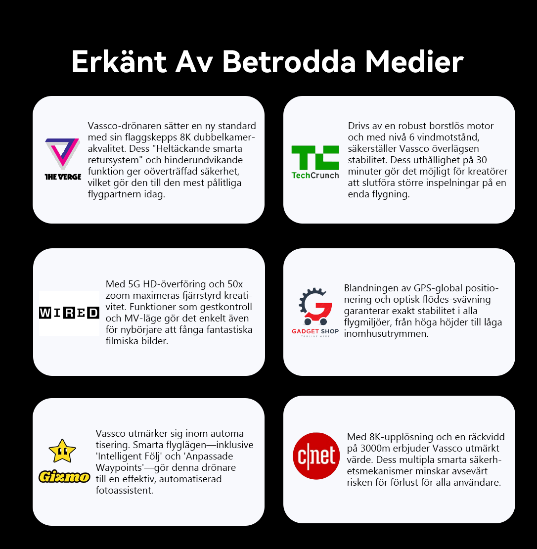 Topprestanda är nyckeln till exceptionella resultat. Vassco-drönaren är utrustad med ett nytt, intelligent 8K-bildsystem i ny generation, utformat för att maximera drönarens potential i luften. Detta är grunden för att skapa ditt mästerverk – det säkerställer att varje flygning levererar biokvalitativa bilder som avsevärt höjer ditt projekts värde och professionella attraktionskraft.