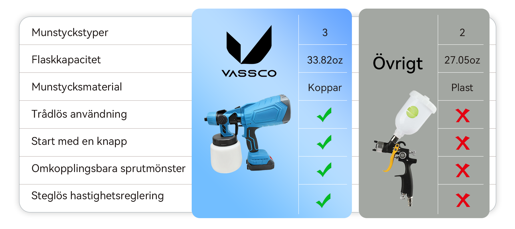 Det var så Vassco Cordless Paint Sprayer föddes. Dess kraftfulla men användarvänliga design gör sprayningen enkel samtidigt som den levererar felfria resultat. Detta speglar Vasscos kärnlöfte: att förvandla tråkiga sysslor till en kreativ glädje, så att du kan fokusera på konsten i ditt arbete.